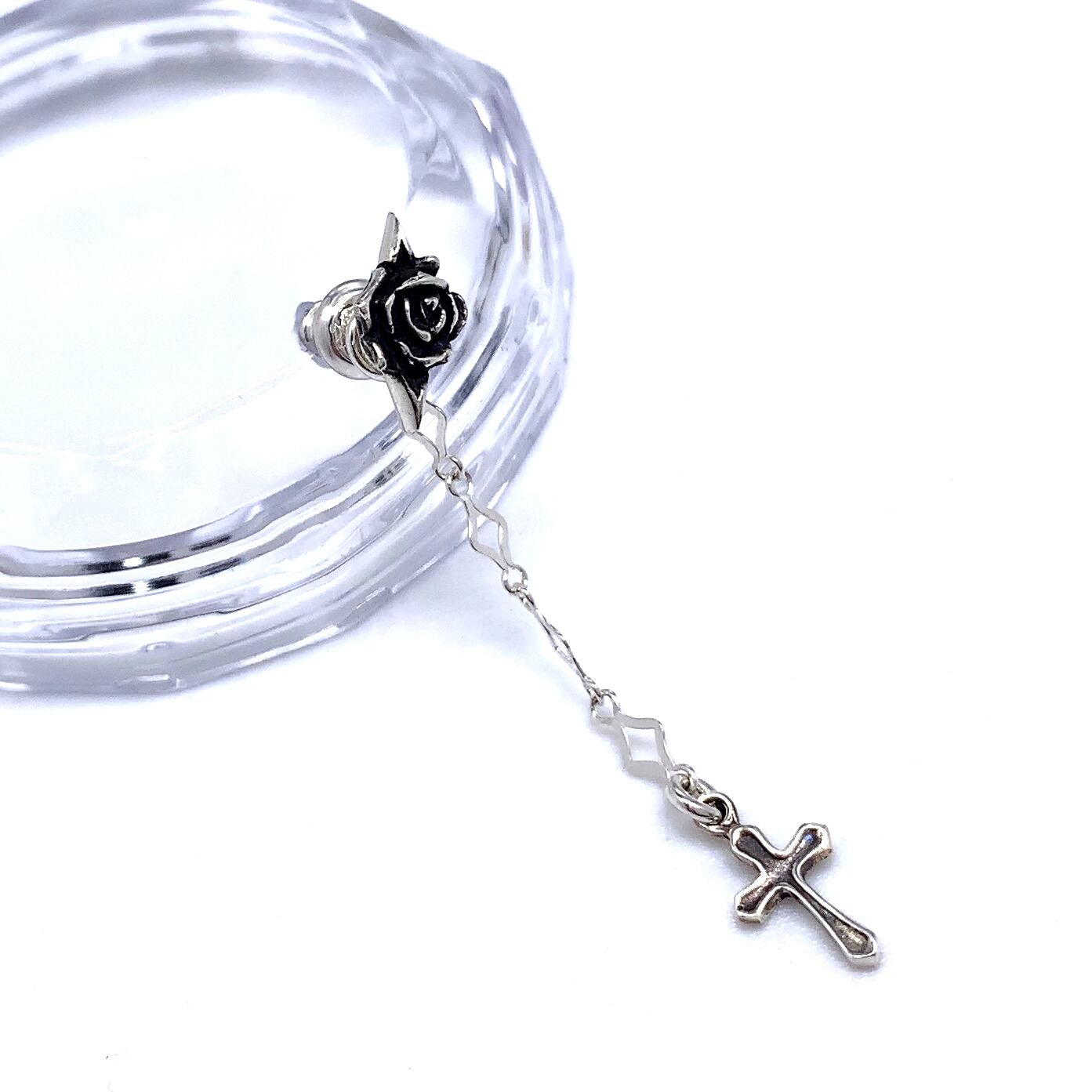 バラのピアスにクロスのチャームがぶら下がったデザイン。