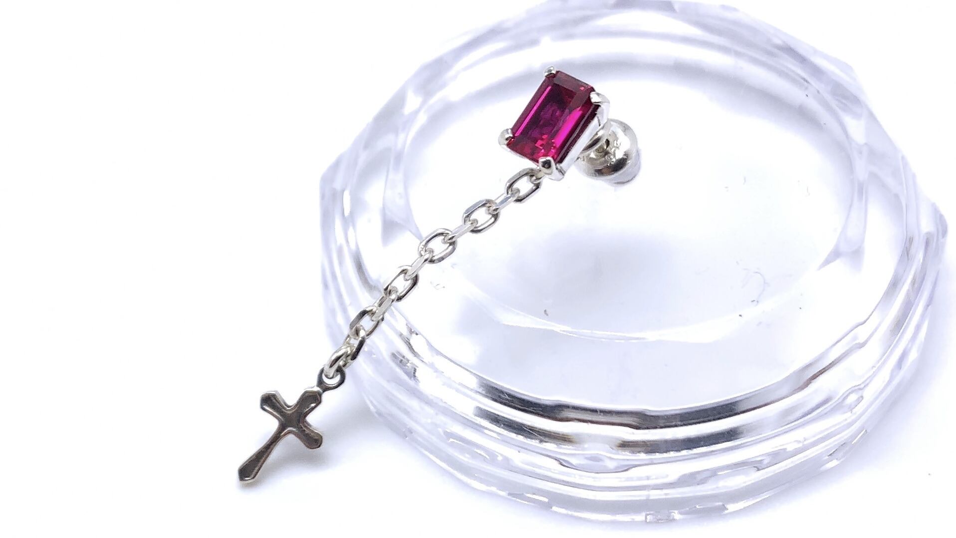 クロスチャームがぶら下がった四角い赤い石のピアスです。