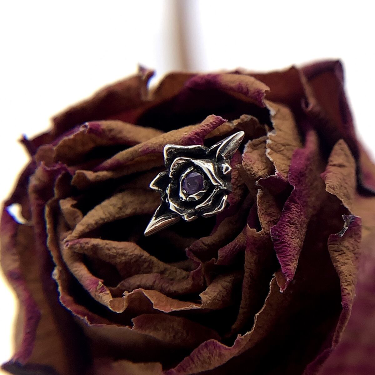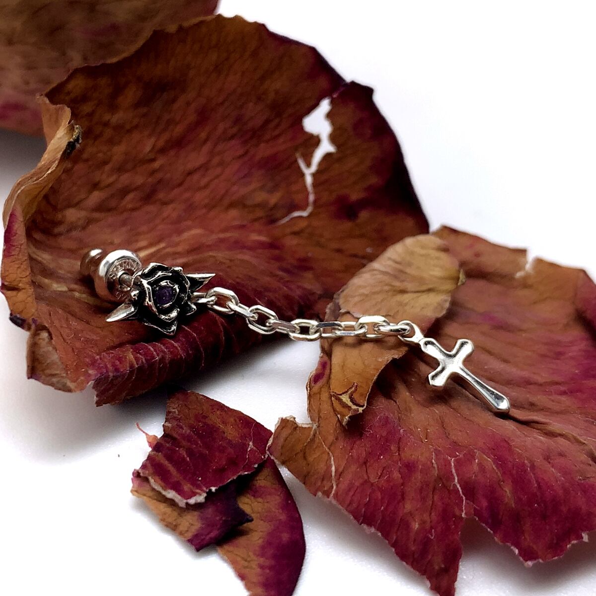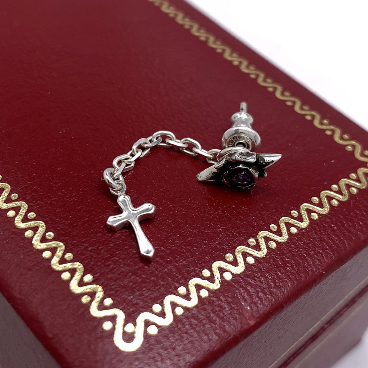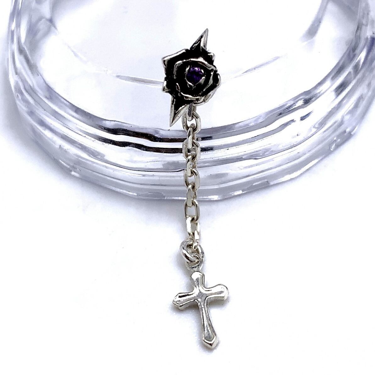 アメジスト/薔薇/十字架 チャーム ピアス/シルバー925/片耳用/セカンドピアス/つけっぱなし/シルバーアクセサリー/ゴシック/パンクロック/メンズピアス